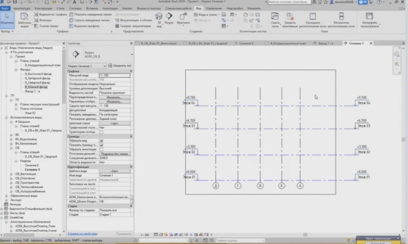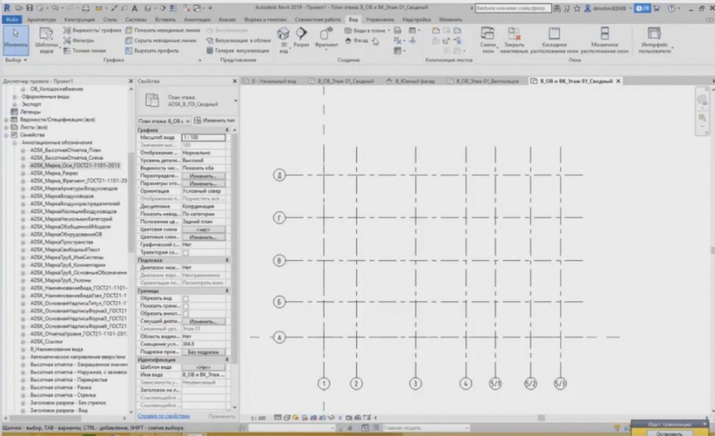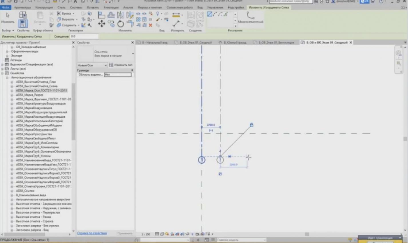 – In the “Project Browser”, we have a special “Families” tab. Open it and all families will be provided as a long list. Certainly, these are not only loadable but also system families; e.g., such as air ducts, curtain walls, flexible air ducts, roofs, staircases are loadable families. It is hard to find the loadable families here; these are mostly system families. Where can we find the representation of the axis? All representations of 2D elements are located in the annotation designations; therefore, we unfold the list and we can see in this tab a long list containing all annotation designations. Now, we are looking for the family of the axis designation. There it is: “ADSK_Axis Mark_GOST21”. Close the list; we have two types with the diameter 8 mm and the diameter 10 mm here.