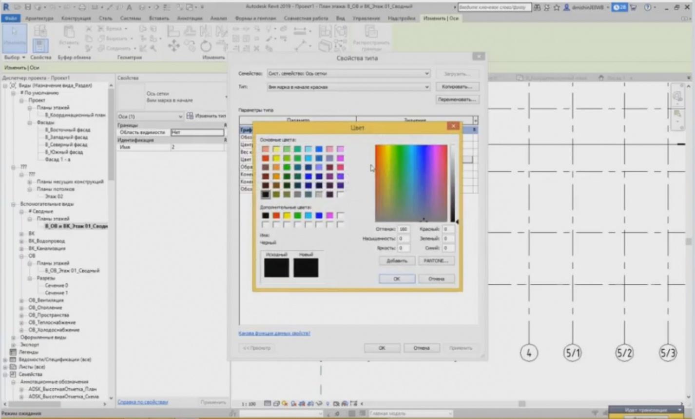 – It is also possible to change the axes colors. But, of course, you have to create new axis types for this. For example, we have a black axis. I can create a new type, copy the existing one and name it as “Red”, and then choose a color. It is red now. Since it is a loadable family, you can see that the element of the loadable family has not changed its color. Therefore, to change the color of the loadable element, you need to change it in the “Family Editor”, but it is a little bit more complicated.