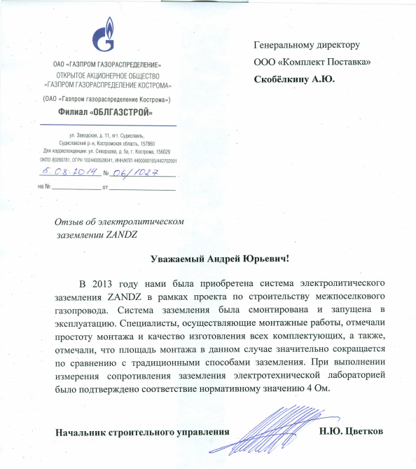 Электролитическое заземление ZANDZ широко и используется в нефтегазовой отрасли крупнейшими предприятиями нашей страны. К примеру, в 2013 году филиал Газпрома — Облгазстрой успешно инсталировал систему электролитического заземления марки ZANDZ на своем межпоселковом газопроводе. Специалисты подтвердили простоту, удобство и легкость монтажа, а также полное соответствие заземления нормативному значению.