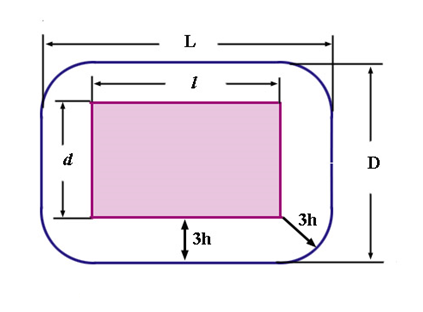 Вторым параметром формулы для вычисления частоты ударов молнии в здание является величина площади стягивания. Особой тщательности вычислений она не требует. Исходя из статистических данных, было принято считать, что границы площади будут проходить на расстоянии, равном трём высотам от внешних стен строения. Построение чертежа не затруднительно (рис. 2). Далее следует вычисление ограниченной площади (синяя линия на рис. 2), при этом можно воспользоваться разными методами, например, миллиметровой бумагой.