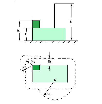 Если дома примерно одинаковы по уровню высоты, предполагается, что зоны распределятся между ними равномерно. Если они имеют большую разницу в высотности, то вручную рассчитать все зоны, наложенные одна на другую, будет проблематично. Это стоит сделать с помощью компьютера. Именно такой способ вычисления лучше предпочесть, если заказчику необходимы точные расчёты. Практика показывает, что заказчиков, которым предельно точно нужно узнать, как часто бьёт молния в место, где будет стоять его дом, крайне мало. Оценку можно считать предельной, ошибки допустимы, в связи с неточной плотностью грозовых разрядов в РФ.