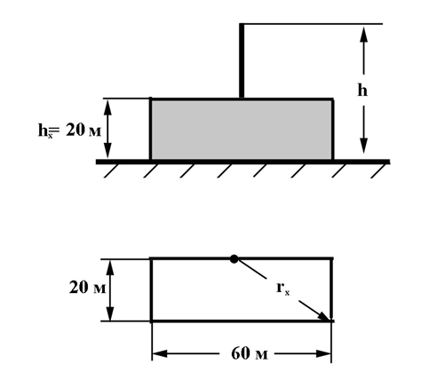 Попробую показать на конкретном примере, что ситуация не столь проста и очевидна. Пусть защищаемое прямоугольное здание при высоте hx = 20 м имеет в плане размеры 60 х 20 м. Одиночный молниеотвод для его защиты предполагается разместить так, как это показано на рис. 1. Молниеотвод должен обеспечить надёжность защиты 0,9.