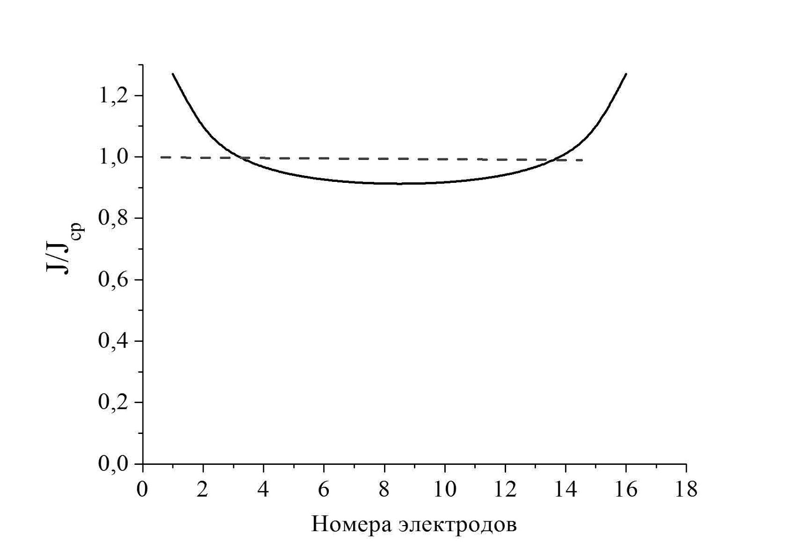 На рисунке результаты точного расчета погонной плотности тока утечки вертикальных заземляющих электродов длиной 5 м, которые были забиты в грунт с шагом 3 м по одной прямой (это для них выше определялись коэффициенты использования). Расчетные значения погонной плотности тока утечки нормированы средним значением этой величины для контура в целом. Для этого ток делился на полную длину всех заземляющих электродов. Нетрудно видеть, что значительные отличия токов утечки от усредненного значения характерны только для самых крайних электродов. У всех других отличие в пределах 10%. Именно это обстоятельство и дает основания ограничиться в расчетах усредненной погонной плотностью токов утечки. Вместо компьютерного решения системы уравнений с десятком, а то и сотней неизвестных удается ограничиться вычислением полной длины подземных электродов lΣ, ну а суммарную величину тока удобнее всего принять равной 1; тогда усредненная погонная плотность тока утечки будет равна