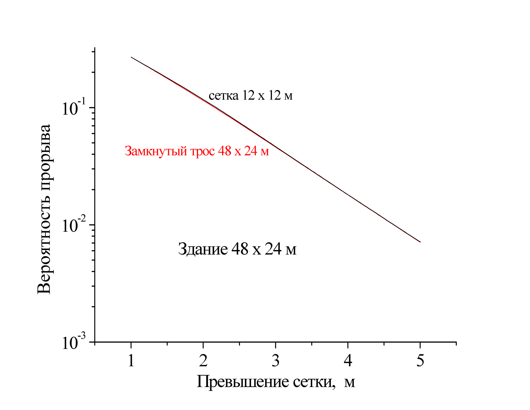 Итак, расчёт в состоянии воспроизвести эффективность работы сетки в штатных для неё условиях. Предположено, что, располагаясь на высоте 30 м над уровнем земли, она защищает людей и оборудование на верхнем этаже здания с диэлектрической кровлей. Для здания 48х24 м сетка 12х12 м отображается в расчётной программе 3-мя тросами длиной по 48 м и 5-ю перпендикулярными им тросами длиной по 24 м. Для сетки 6х6 м над тем же зданием в программу надо ввести 14 тросов. Переменным параметром в расчёте является превышение сетки над защищаемыми элементами здания.