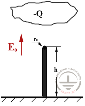 Пусть грозовое облако создало у земли электрическое поле напряженностью E0 (для простоты,- однородное), в котором размещен объект высотой h с вершиной радиуса r0. Потенциал грозового поля в месте расположения вершины равен U0(h) = -E0h (знак минус учитывает направление вектора E0 на рис. 21). Однако, объект заземлен и потому его потенциал тождественно равен нулю. Для этого на вершине за счет электростатической индукции должен быть наведён заряд Qind, который своим полем доведёт суммарный потенциал до нулевого значения: