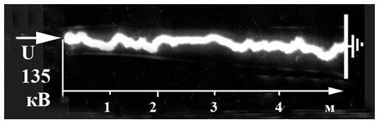 Лабораторные эксперименты удивили низким напряжением, которое требовалось для формирования скользящих искровых каналов. Фотография на рис. 17 получена при исследованиях искровых каналов длиной 5 м, когда напряжение источника питания составляло всего 135 кВ. В полевом эксперимента отечественные специалисты (ВНИИЭФ г. Саров) наблюдали искровые каналы длиной до 30 м при напряжении около 300 кВ. В воздухе для той же цели потребовалось бы на порядок более высокое напряжение. Оказалось, что всему виной токи утечки в грунт через боковую поверхность плазменного канала. Именно они поддерживают его температуру на уровне 5000-6000 К и тем самым не позволяют потерять высокую проводимость родившейся плазме. Канал может прорастать практически любое время, пока молния питает его своим током.