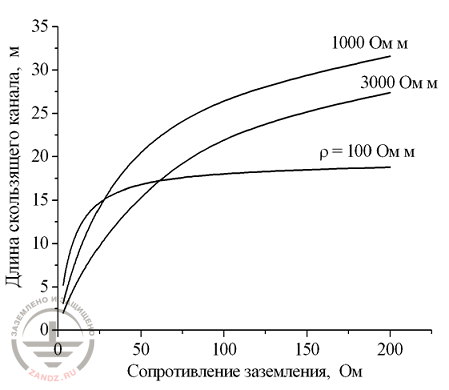 Рисунок 18. Предельная длина скользящих искровых каналов в зависимости от параметров грунта и сопротивления заземления в точке удара молнии