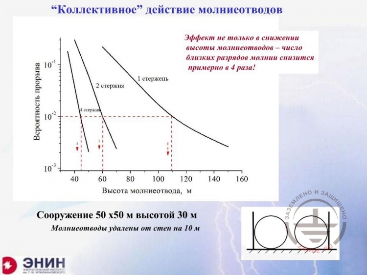 — Есть ещё один момент в МЭКе, который мне кажется страшно важным. Если расстояние между молниеприемниками или между молниеотводами больше, чем радиус катящейся сферы, то каждый из таких молниеотводах по стандарту МЭК надо рассматривать, как отдельно стоящий. Он действует независимо от всех других молниеотводах. А опыт эксплуатации линии электропередачи говорит, что если у вас есть не один молниеприёмник, а несколько, например, два грозотроса, то надёжность защиты резко повышается за счёт их коллективного действия. Правый трос принимает в основном молнии справа. Левый трос в основном принимает молнии слева. Надежность защиты двух этих тросов резко возрастает. Резко возрастает и надёжность защиты стержневых молниеотводов, каждый из которых принимает наибольшее количество молний из-за своей спины. Посмотрите ситуацию, которая демонстрирует эта на примере. Ситуация такая, у меня сооружение 50 на 50 метров, высотой 30 метров. Я хочу это сооружение защитить отдельно стоящим молниеотводом, если у меня надёжность защиты будет на уровне 0,99, то есть одна молния из ста прорывается, высота молниеотвода, которая мне потребуется, находится больше, чем сто метровая высота. Если я возьму два стержневых молниеотвода, у меня эта высота снижается примерно до 60 метров. Если я возьму четыре молниеотвода, у меня высота снижается почти до 40 метров. Все это из-за того, что каждый молниеотвод будет принимать на себя разряды молнии со своей стороны. Этот эффект многократных молниеотводов очень широко используется на практике, по стандарту МЭК он вообще не существует. О коллективном действии молниеотводов МЭК не говорит ничего.