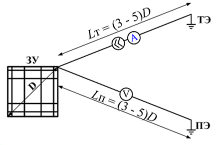 Это полагается делать в процессе завершения монтажных работ и перед каждым грозовым сезоном. Принцип работы любого измерительного прибора сводится к методу амперметра и вольтметра. Встроенный генератор прибора нагружает контролируемый заземлитель током известной величины I, а вольтметр измеряет напряжение на заземлителе UЗ относительно бесконечно удаленной точки. По закону Ома частное от деления этих величин дает сопротивление заземления. RЗ = UЗ/I. Проблема организации измерений связана только с монтажом схемы. Для ввода тока надо поместить в грунт вспомогательный токовый электрод, а для измерения напряжения следует найти "бесконечно далекую" точку нулевого потенциала, чтобы ввести в неё ещё один вспомогательный электрод для подключения вольтметра. Всё это требует немалого свободного пространства. Иначе никак не исключить взаимного влияния между электродами и искажений ими режима растекания тока. Вот как рекомендуется размещать элементы измерительной цепи в существующих руководствах (рис. 10).