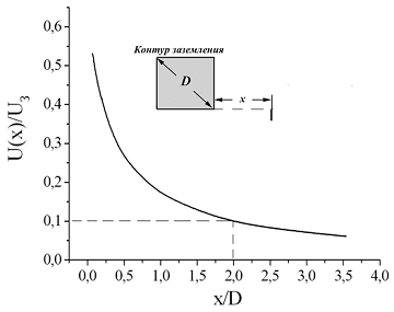 Здесь все опять определяется максимальным габаритным размером заземляющего устройства. Чем он больше, тем медленнее снижается потенциал в грунте при растекании тока. До нуля он снизится в бесконечности и туда с измерительными проводами не добраться. Приходится соглашаться на некоторую ошибку, скажем, в пределах 10% (для молниезащитных дел вполне приличная точность). Расчетные зависимости на рис. 11 и 12 показывают, как снижается потенциал на поверхности земли в окрестности протяженной горизонтальной шины радиусом 10 мм и в окрестности контура заземления с ячейками 10х10 м из таких же шин. В первом случае для требуемого снижения потенциала надо удалиться от заземлителя примерно на длину шины, во втором – на две диагонали контура. Это могут быть совсем не малые расстояния, потому что контур заземления с диагональю в 200 м и более в технике не редкость. Тем не менее, в руководствах рекомендуются ещё более значительные расстояния. Они необходимы, чтобы устранить мешающее влияние вспомогательного электрода, через который замыкается ток нагрузки заземлителя.