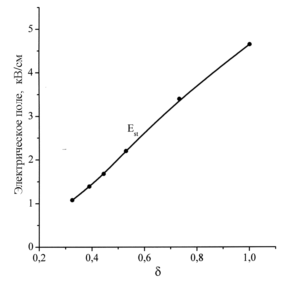 Спрайты с их ярким красноватым свечением стартуют почти от нижней границы ионосферы, с высоты 80 - 90 км и распространяются вниз, к земле на 30 - 40 км и более. Их наиболее высокая стартовая часть представляет собой сплошную светящуюся область диаметром в десятки километров. На высоте ниже 70 км наблюдается ветвление разряда. Скоростные фотокамеры фиксируют толстые шнурованные каналы. Для описания спрайтов пытаются использовать представления о стримерах, которые детально изучены в лаборатории при атмосферном и пониженном давлении. В частности установлено, что среднее электрическое поле для их развития резко снижается при уменьшении давления, для катодонаправленных стримеров - от 4,5 до 1 кВ/см в диапазоне изменения относительной плотности воздуха δ = 1 – 0,3 (рис. 5). Нет оснований предполагать, что подобная тенденция не продолжится далее, обеспечивая очень большую длину стримерных каналов.