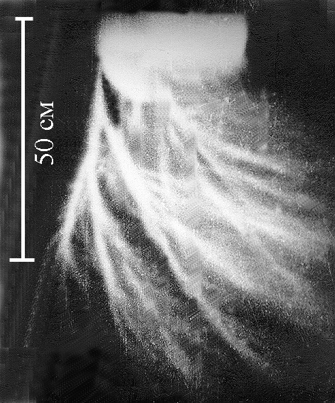 Что же касается радиуса стримеров, то расхожее утверждение об их малости далеко от истины даже при нормальной плотности воздуха. На деле радиус определяется ионизационным расширением канала, которое продолжается, пока напряжённость электрического поля на границе не достигнет порога ионизации Ei ~ δ-1. При высоком напряжении радиус стримеров измеряется сантиметрами и при нормальных атмосферных условиях (рис. 6). Остается учесть, что даже у нижней границы спрайта плотность атмосферного воздуха примерно на 3 порядка величины меньше нормальной и потому радиус каналов измеряется здесь не сантиметрами, а многими метрами.