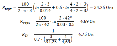 Расчетное сопротивление заземляющего устройства составляет 4,75 Ом, что меньше допустимого сопротивления 10 Ом.