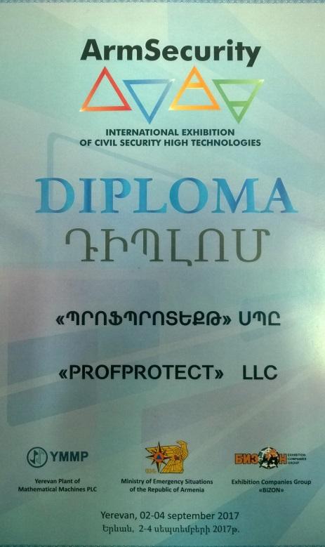 Почетными гостями I Международной выставки высоких технологий безопасности «Arm-Security-2017» (Безопасная Армения) стали официальные делегации около 20 стран, а также члены правительства Республики Армения. В их числе — министр обороны и министр по чрезвычайным ситуациям Республики Армения, руководители других государственных органов. Официальные делегации также посетили стенд ООО «Профпротект», где смогли ознакомиться с образцами оборудования и получить ответы на вопросы по заземлению и молниезащите.