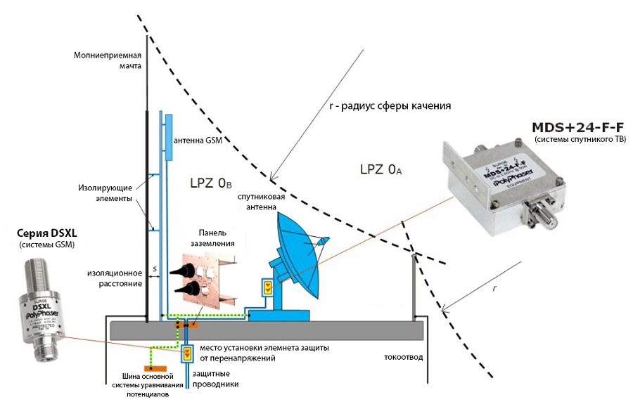 Для этого используются молниеприёмные мачты, которые создают защитную зону, препятствующую прямому удару молнии в спутниковые тарелки и другое оборудование. Кроме этого, все сигнальные кабели, находящиеся во внутренней части здания, должны быть защищены от перенапряжения с помощью специальных устройств. Например, устройствами ZOP-SAT от компании RST, позволяющими обеспечить безопасность сигнальных линий.