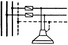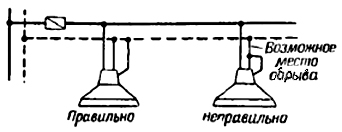 На рис. 15 показано включение ламповых патронов. Помимо случаев неправильной установки выключателя, здесь могут иметь место неправильные присоединения фазного провода к винтовой гильзе патрона, что не должно допускаться, так как во многих конструкциях гильза недостаточно закрыта от случайного прикосновения.